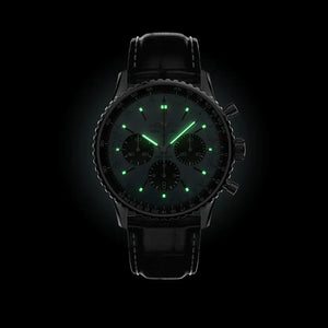 The black alligator leather strap with a stainless steel folding clasp ensures comfort and secure wear, whether in flight or during everyday use.