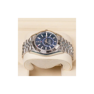 The RL Sky-Dweller Ref. 326934-0004 is the ultimate companion for global travelers, combining timeless elegance with cutting-edge RL innovation. Crafted in White Rolesor — a fusion of Oystersteel and 18 ct white gold — this 42 mm timepiece features a striking blue sunburst dial, a fluted white-gold bezel, and RL’s patented Saros annual calendar, elegantly displaying both date and month. The dual time zone 24-hour display ensures effortless tracking of home and local time, making it perfect for the modern jet-setter.