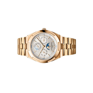 The V Constantin Overseas Perpetual Calendar Ultra‑Thin Ref. 4300V/120R‑B064 is the pinnacle of haute horlogerie elegance, seamlessly combining technical sophistication with sporty refinement. Housed in 18 kt rose gold, the watch measures 41.5 mm in diameter yet maintains an astonishingly slim profile of 8.10 mm, remarkable for a perpetual calendar complication.
